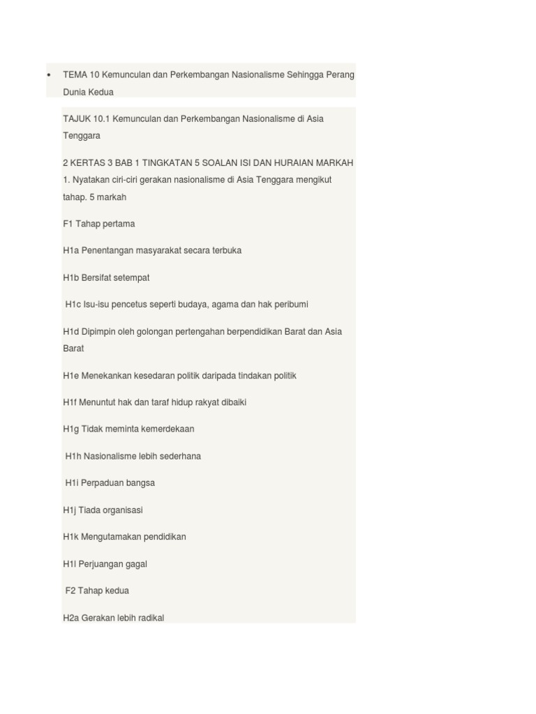Soalan kertas 3 bab 1kemunculan dan perkembangan nasionalisme di asia tenggara TemaTajuk101 Nasionalisme di Malaysia sehingga Perang dunia Kedua Soalan Imperialisme Barat di Asia Tenggara sejak abad ke-16 didorong oleh keinginan untuk mengeksploitasi ekonomiBerdasarkan pengetahuan sejarah andaapakah iktibar yang boleh diteladani oleh Malaysia dalam usaha. TEMA 10 Kemunculan Dan Perkembangan Nasionalisme Sehingga Perang Dunia Kedua.